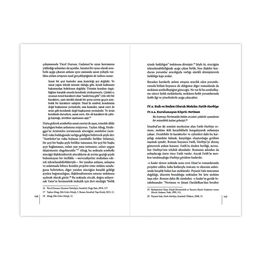 Mekânın oluşla (zaman), oluşlarda meydana gelen bir varlık kazanma olduğunu düşündüğümüzde, mekâna (space) anlam verenin, yerdeki (place) imkânın farklı perspektiflerle (mimari, musiki, şiir, roman, resim ve benzeri) açığa çıkması olduğu söylenebilir. Her açığa çıkışla, ontik olan (yer), ontolojik (mekân) bir mahiyet kazanır. Verili zeminin (yer) potansiyellerini fark etmeye, imkânlarını açığa çıkarmak üzere onunla ilişkili olmaya, diyalog kurmaya, mekânın vuku bulması olarak bakılabilir. Başka bir deyişle, bir konu (sache) olarak yer, mekânlaşmasını etrafında cereyan eden yorumlarda bulur. Diyebiliriz ki yer, kendinde tuttukça, kendinden bahsettirdikçe mekânlaşır.