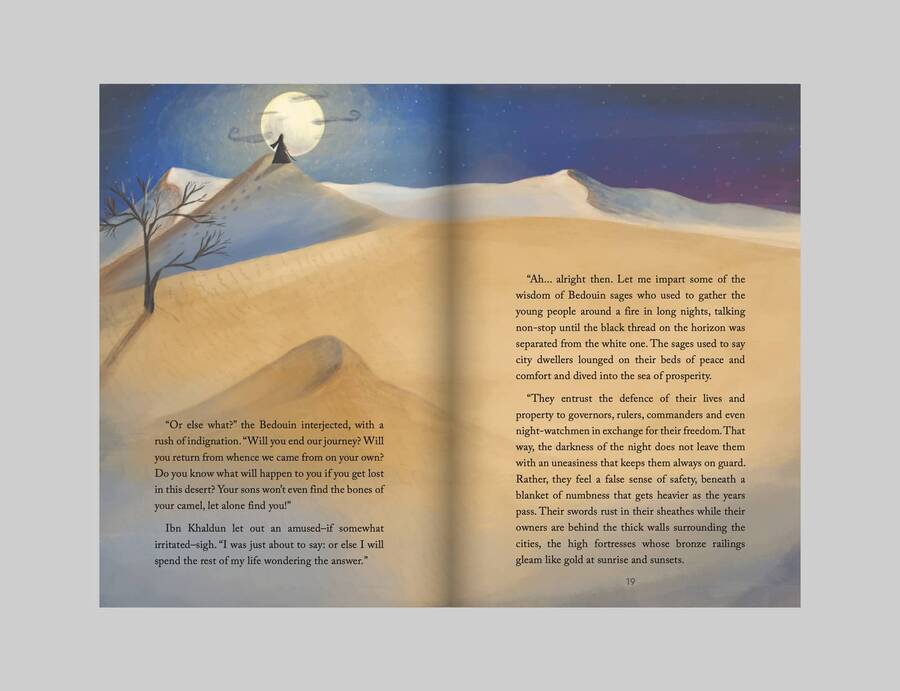 This book tells the fictional story of a quest inspired by Ibn Khaldun’s ideas about people who lived in cities and the bedouins who lived in the deserts and rural areas as nomads. The events in the story have not taken place in reality. Perhaps some of it did happen since Ibn Khaldun did live among the bedouins for a long time, travelled with them, conversed with them in the night, and observed them closely.